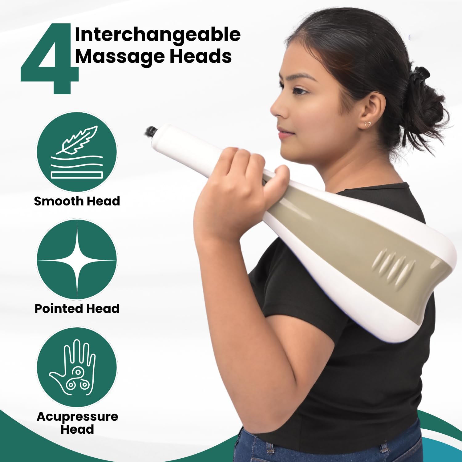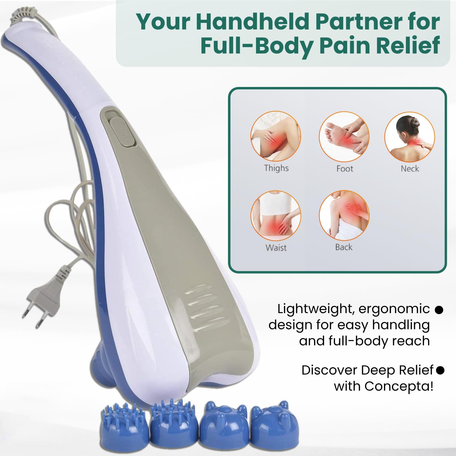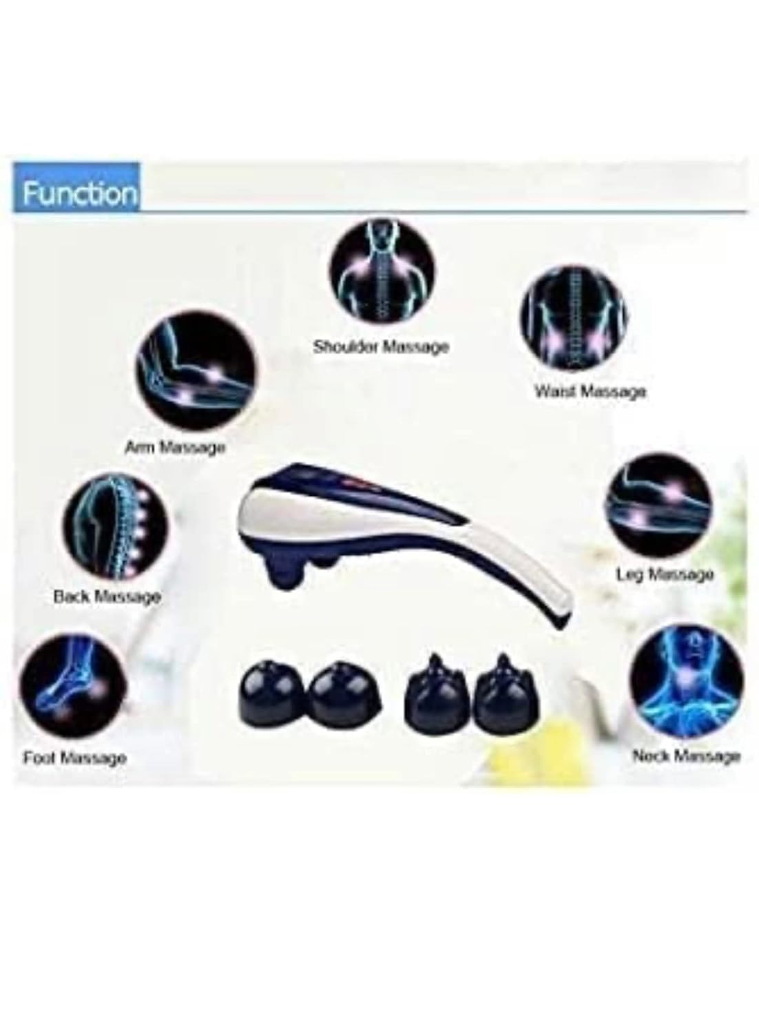 - 𝟑 𝐌𝐚𝐬𝐬𝐚𝐠𝐞 𝐀𝐭𝐭𝐚𝐜𝐡𝐦𝐞𝐧𝐭𝐬 𝐈𝐧𝐜𝐥𝐮𝐝𝐞𝐝 – Equipped with three interchangeable massage attachments to suit different body areas and massage intensities. This massage machine allows personalized physiotherapy for the full body.